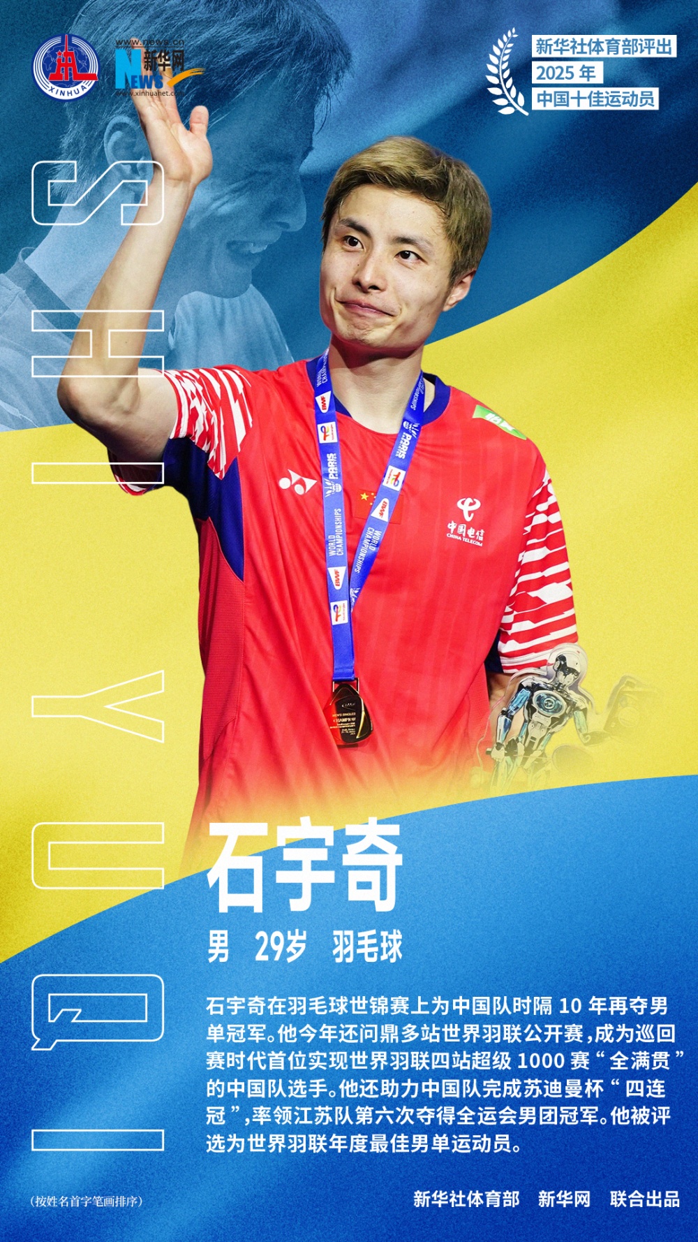 石宇奇10年来首次在羽毛球世锦赛上为中国队夺得男单冠军。今年他还力争多项世界羽联公开赛冠军,成为首位在巡回赛期间四次世界羽联超1000赛事实现“大满贯”的中国选手。他还帮助中国队完成苏迪曼杯“四连冠”,并率领江苏队第六次夺得全运会男团冠军。他被选为世界羽联年度最佳男单运动员。